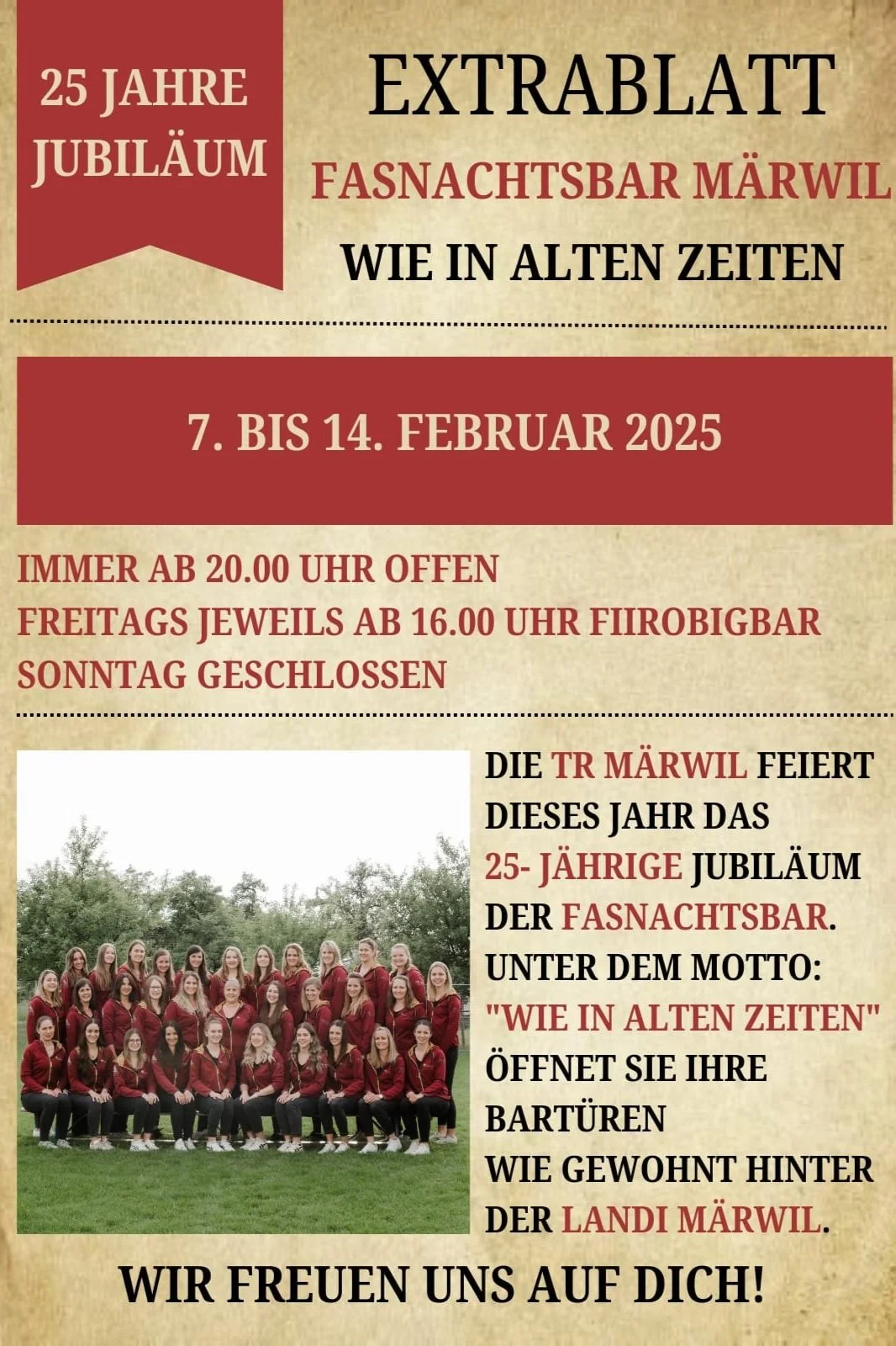 Unter dem Motto "Wie in alten Zeiten" öffnen wir vom 7. bis 14. Februar 2025 die Türen unserer Bar. Ihr könnt uns jeden Abend besuche, ausser am Sonntag, dann müssen wir kurz durchatmen ;-) Freitags ist die Bar bereits ab 16.00 Uhr geöffnet und ihr könnt euer Fiirobig-Bier bei uns trinken.